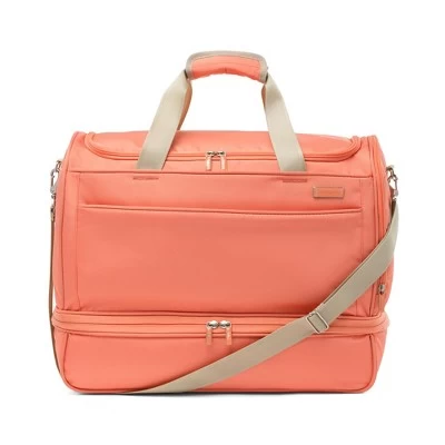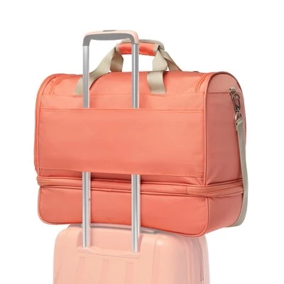 Colorful, adaptable, and fun like you, the Atlantic® Drop-Bottom Weekender is a cheery, multi-use bag, sure to become your new favorite sidekick. Tough enough to handle any travel, toddlers, and teens, carrying it also makes you feel good about doing good, because its splash-proof exterior fabric and interior lining are made from 27.5 post-consumer recycled plastic bottles. As Chief Fun Officer, now you can add planet-saving hero to your list of feats! Multi-task like the master you are with built-in pockets and a drop-bottom compartment that lets you divide and conquer, keeping shoes or toys separate but easy to find. Toss your phone and keys in the quick-access front pockets for fast retrieval. Ready to go when you are, this perfect companion bag has comfortable handles for grabbing and an adjustable shoulder strap, but its rear strap lets you stack it on your spinner so you can free your hands to wrangle the rest of your crew.