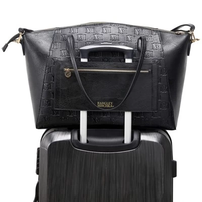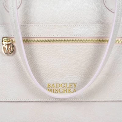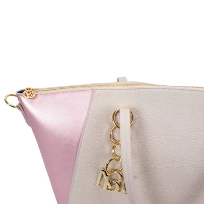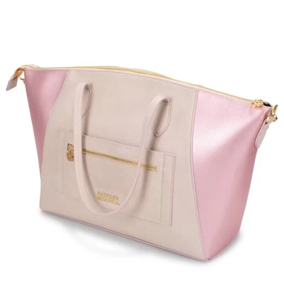 The Caroline weekender is a combined matte and metallic vegan leather medium bag suitable for travel or everyday fashion. Features gold hardware, two medium-length handles, a removable shoulder strap, decorative ornament, a main compartment with organizer pockets, and a trolley passthrough with a zippered pocket.