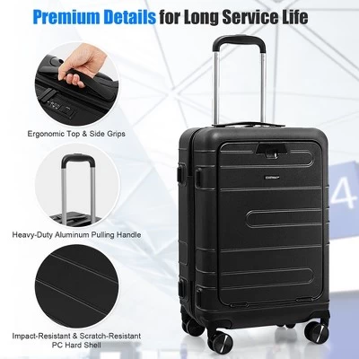 Our 20” carry-on luggage measures 14” x 9” x 21.5”(L x W x H), which is enough for short trips and business travels, and it can load up to 88 lbs. The hardshell suitcase comes with a front pocket with 5 compartments: a padded laptop pocket, an iPad pocket, 2 ID bags, and a mesh pocket, meeting your multiple storage needs. And we suggest storing a 15.6” laptop and a 9.7” iPad. More than that, the spinner luggage is equipped with a foldable tabletop and a USB port, making your travel more convenient. And the 3-digit combination TSA lock keeps your belongings safe and secure. Quiet spinner wheels and a height-adjustable telescoping handle allow you to maneuver the suitcase easier, saving your effort. With an all-black appearance and clear lines, the practical hardshell suitcase can also add a sense of fashion for you.