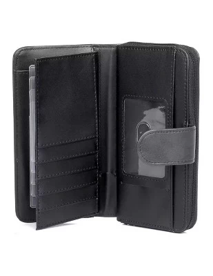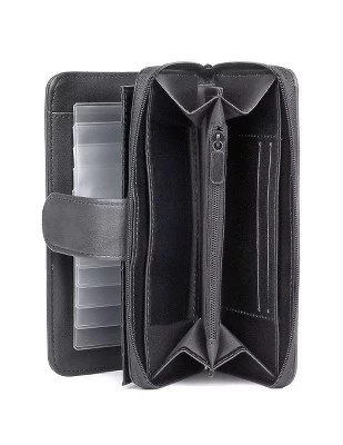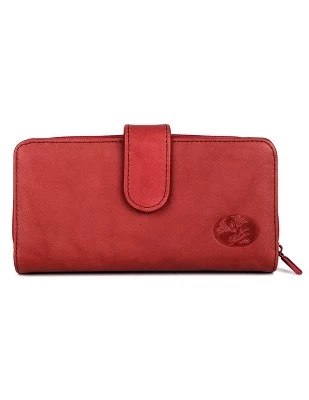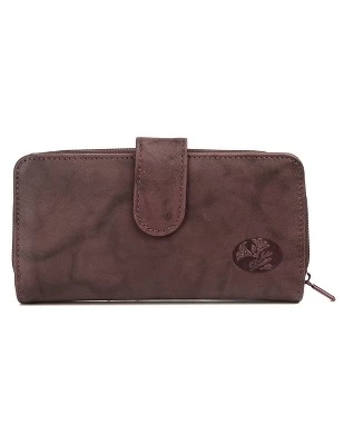 - Authentic Crunch Leather, Rich Floral Emboss Logo Heiress Checkbook Wallet features a full zip-around double compartment with inside zipper pocket and 2 credit card slots, checkbook cover, I.D. window, bill compartment, 2 storage pockets and 5 additional credit card slots.