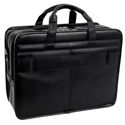 Protect your 17″ laptop from bumps and dust while on the go with this leather laptop case. It has multiple compartments and pockets for storing overnight essentials and small items. Its exterior leather shell is lined with nylon for super strength. Smooth zipper closures keep the contents secure. This rolling laptop case has wheels for easy transportation. Detach the laptop case from the rolling base when you want to carry it. It has a retractable handle and a removable strap. Wipes clean with a damp cloth.