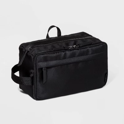Keep your toiletries neat, tidy and easily accessible with this Dopp Kit Clutch from Goodfellow & Co™. This toiletry organizer is made from sturdy fabric with a textured solid-color finish, and is fully-lined to help protect the bag from spills or stains. The roomy compartment with a zipper fastening and a myriad of exterior and interior pockets offers you the convenience to stash your daily essentials — razors, lotions, moisturizers, eye drops and more. The side handle allows for easy carrying , while the structured flat bottom helps to keep your grooming essentials in upright condition for neat organization.