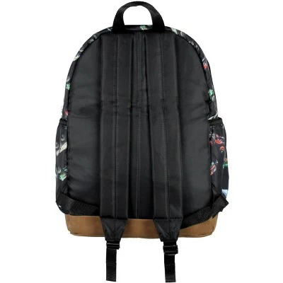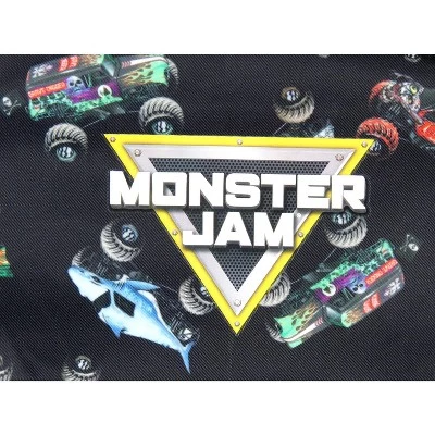 - BACKPACK DESIGN – The backpack features an all-over print of some of Monster Jam’s fan-favorite cars: Dragon, Zombie, Grave Digger, and Megalodon, all against a black background.
