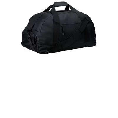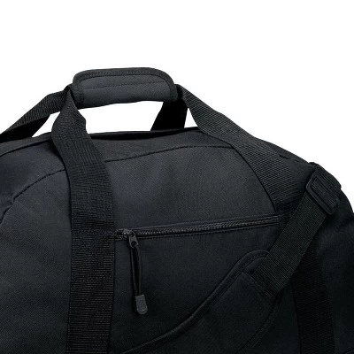 A versatile classic duffel in solid colors. 600 denier polyester canvas. Large center opening for easy packing. Interior zippered pocket. Front zippered pocket for easy decoration Zippered end pocket for shoes towels or gear. Built-in bottom board for shape retention and strength. Detachable adjustable padded shoulder strap Dimensions: 13 h x 23.5 w x 11.5 d; Approx. 3 513 cubic inches Note: Bags not intended for use by children 12 and under. Includes a California Prop 65 and social responsibility hangtag.