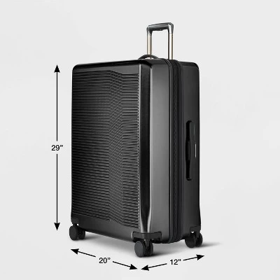 - Hardside suitcase measures 29″ x 20″ x 12″ (including wheels)