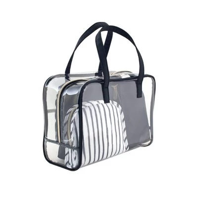 Whether you’re leaving for a short weekend trip with friends or embarking on a longer adventure, this Makeup Organizer Bag Set from Sonia Kashuk™ neatly stores your makeup essentials. Complete with a large clear weekender bag, large zip pouch, pencil case and a round-top pouch, this makeup bag set provides endless storage and organization options for makeup, toiletries and more. The transparent design allows for easy viewing of contents inside, while the black and white stripes and solid black pouches lend a stylish, on-trend look. Chic and functional, this makeup organizer bag set is great for taking your favorite products on the go or keeping them organized in one spot at home.